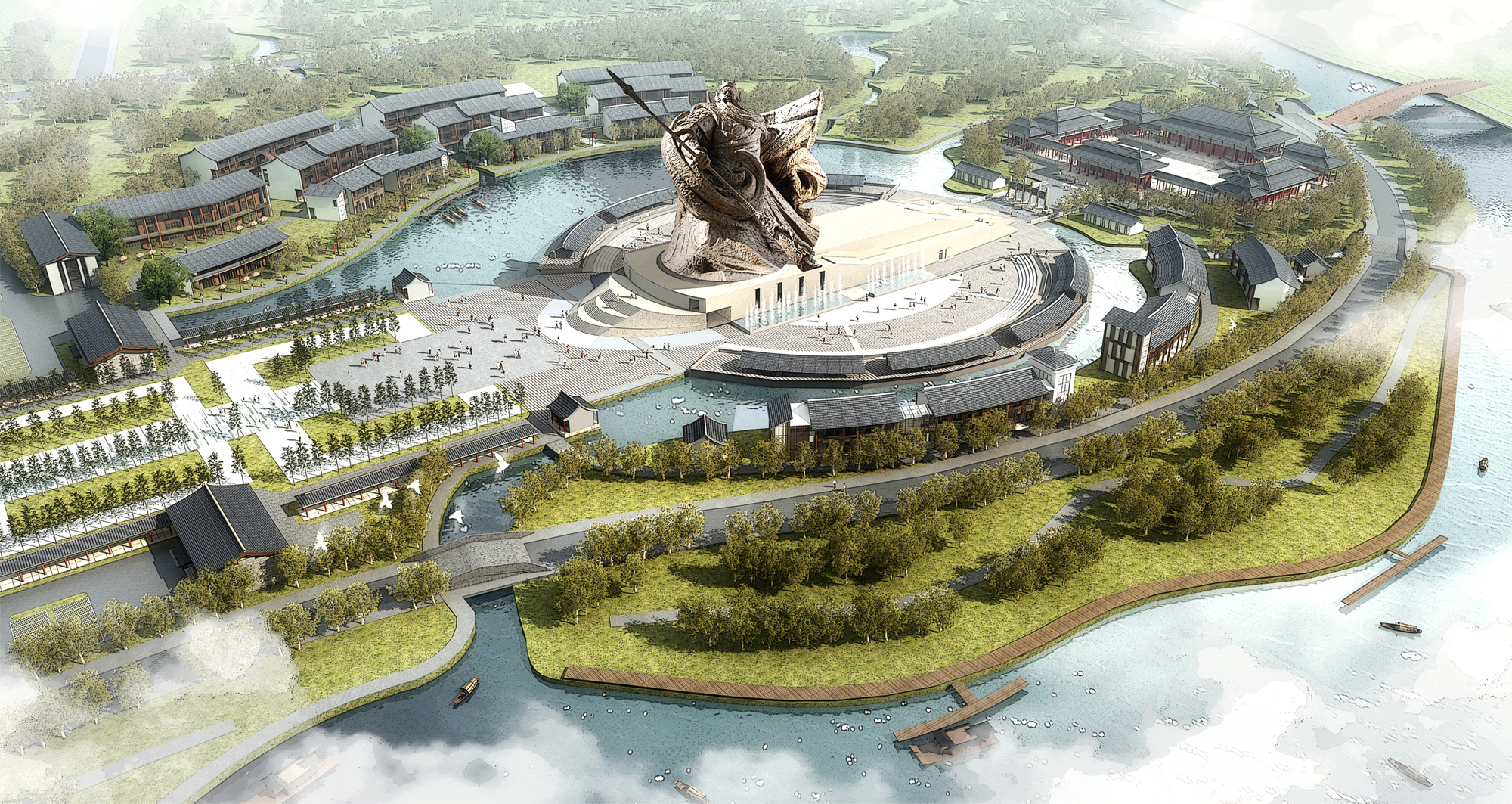 關公文化園位于湖北省荊州市,在園區布局上由南向北進,以“義”的概念貫穿園區規劃。 圣像基座、園區環境、配套建筑突出雕像”義薄云天“的氣勢。中軸主要建筑群,以關公圣像為核心。而圣象又以雕塑建筑化為手法,在其基座內建設關公紀念館,營造祭祀、表演、眺望、景仰空間。