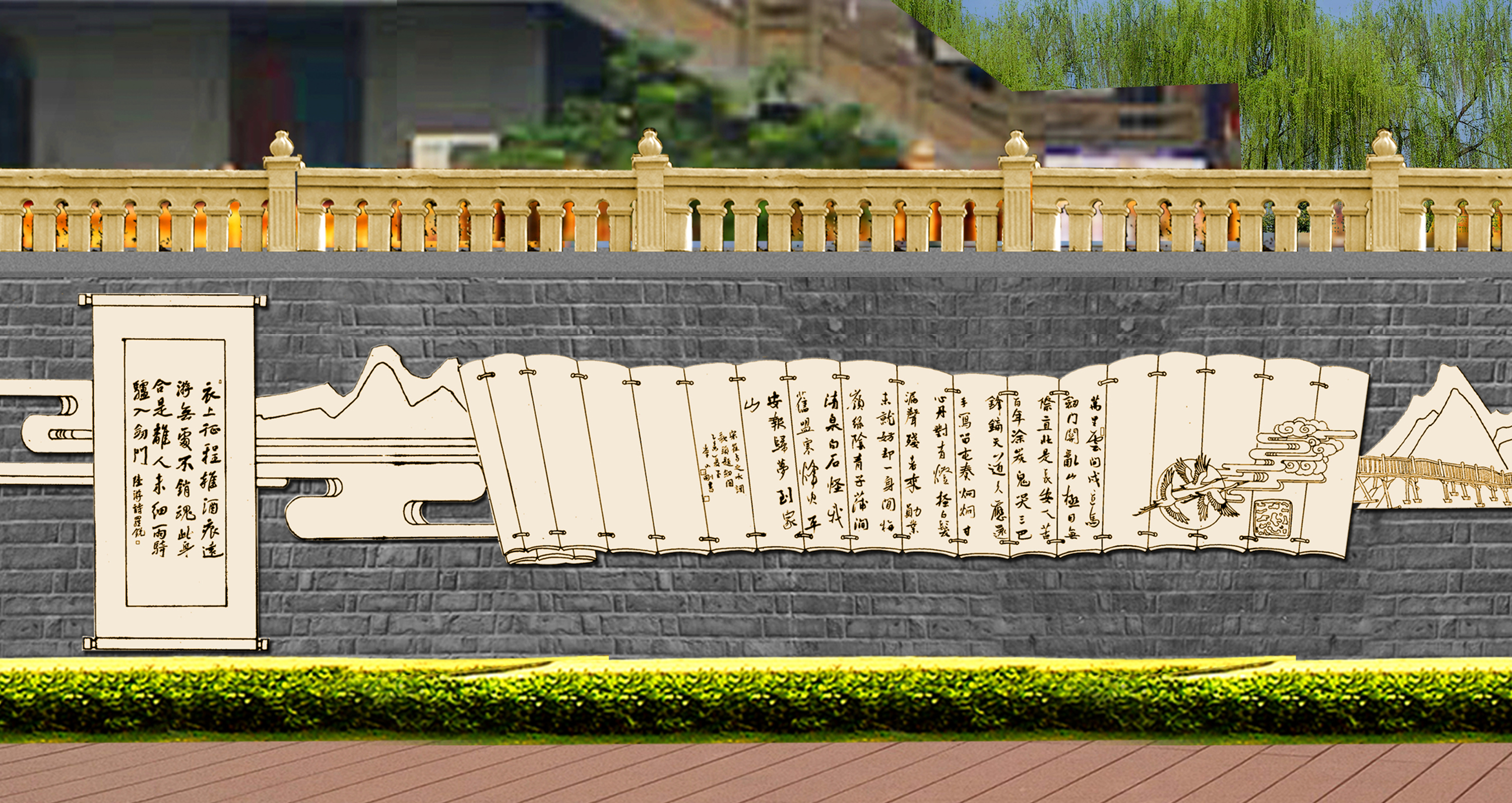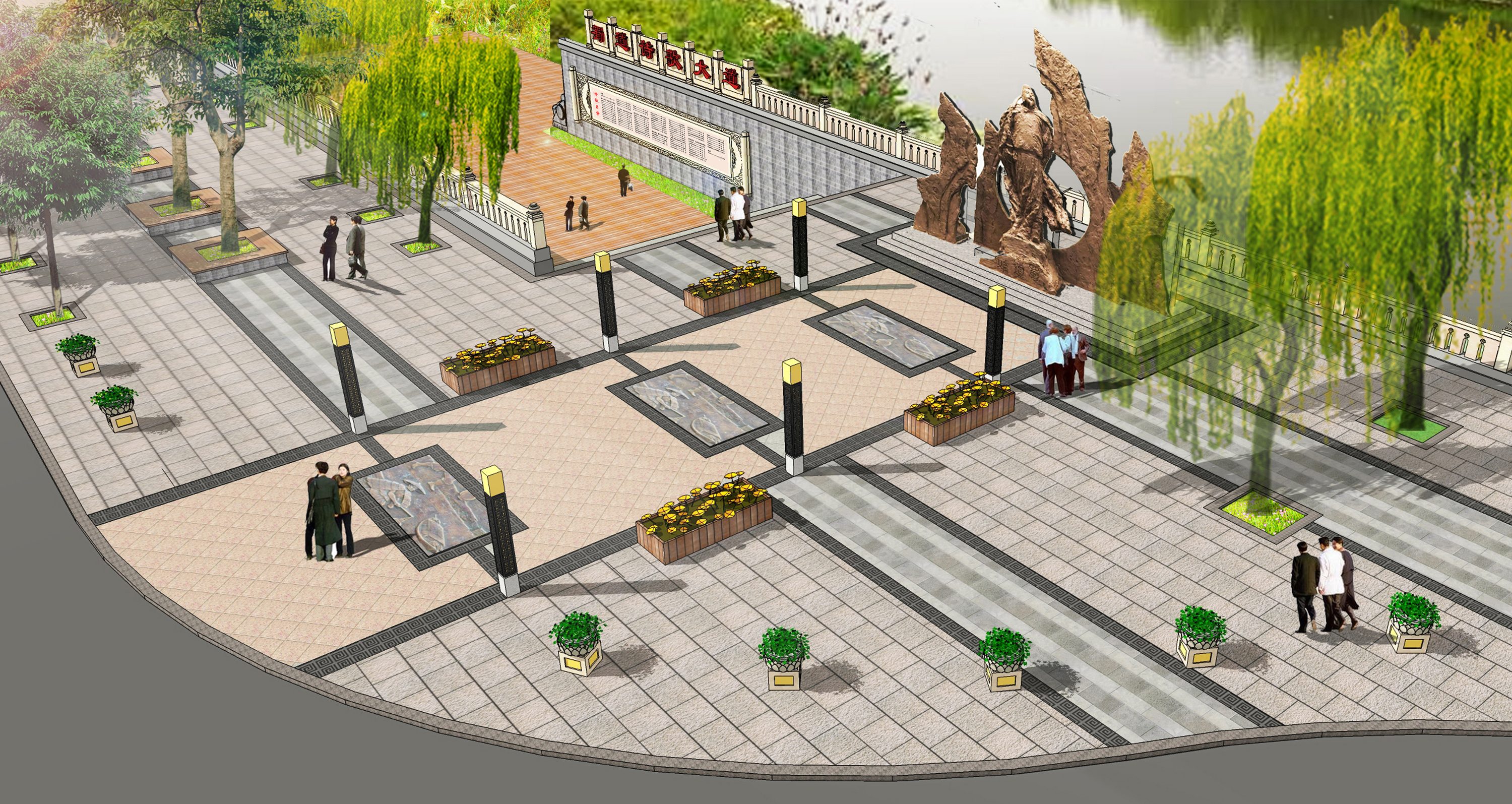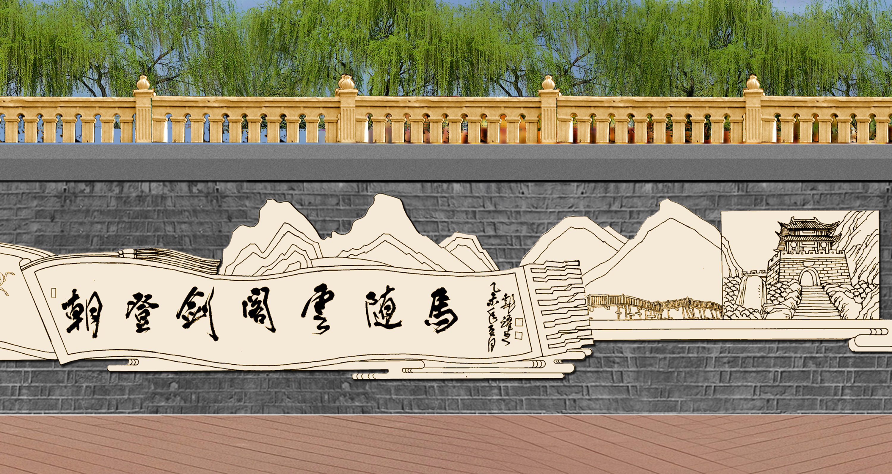 蜀道詩歌大道位于廣元市區(qū)嘉陵江畔,背靠鳳凰山景區(qū),與皇澤寺景區(qū)隔江相望。整個蜀道詩歌大道沿著廣元市區(qū)的嘉陵江,從摩爾天城到將軍橋,途經(jīng)利州西路、打鐵街、大西路、望江樓、小西路、皇澤大橋等,全長約3 公里。通過對蜀道文化的深刻解讀,以廣元“生態(tài)立市、文旅興市”的發(fā)展戰(zhàn)略為理念,充分結(jié)合大唐利州女皇城、國家歷史文化名城創(chuàng)建、嘉陵江生態(tài)文化休閑軸營造文化休閑長廊。設(shè)計(jì)上以石刻為核心表現(xiàn)手法,同時融合蜀道山川、壁畫、卷軸、碑林、綠植等設(shè)計(jì)元素,營造出整體統(tǒng)一、厚重,局部多姿多彩的蜀道詩歌大道。