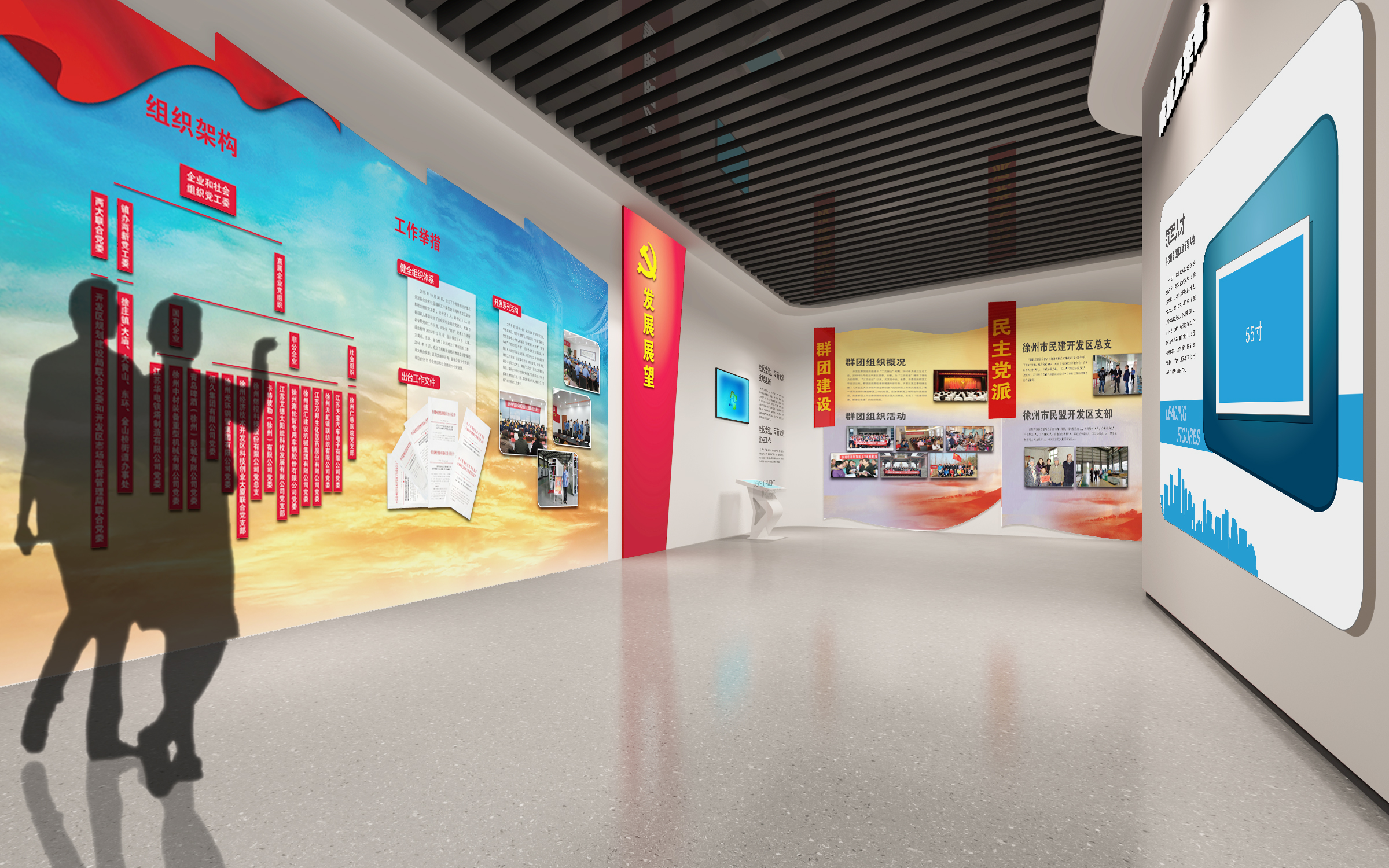 其中布展建筑面積約880平方米,共分為序廳、薪火相傳、開發區實踐、黨的建設、黨群建設等五部分,用流暢緊湊的參觀流線,系統展示徐州經濟開發區全面貫徹黨的精神,緊緊圍繞“三次創業”的發展戰略,努力建設“經濟強、百姓富、環境美、社會文明程度高”的升級版的國家級開發區的輝煌前景。另外配套設置了主題展廳、圖書閱覽室、黨員“創客”夢吧、群團活動中心、心靈驛站、黨員教育室、遠程教育室、接待室、咖啡吧、便民超市、辦公室、檔案室、流動黨員活動站、多功能廳等空間。