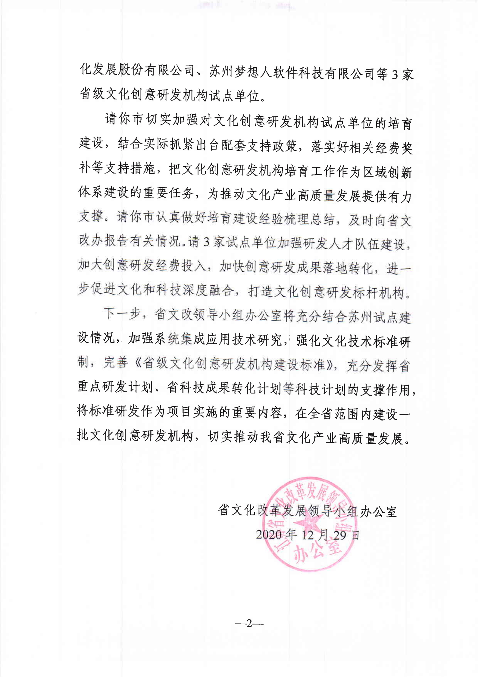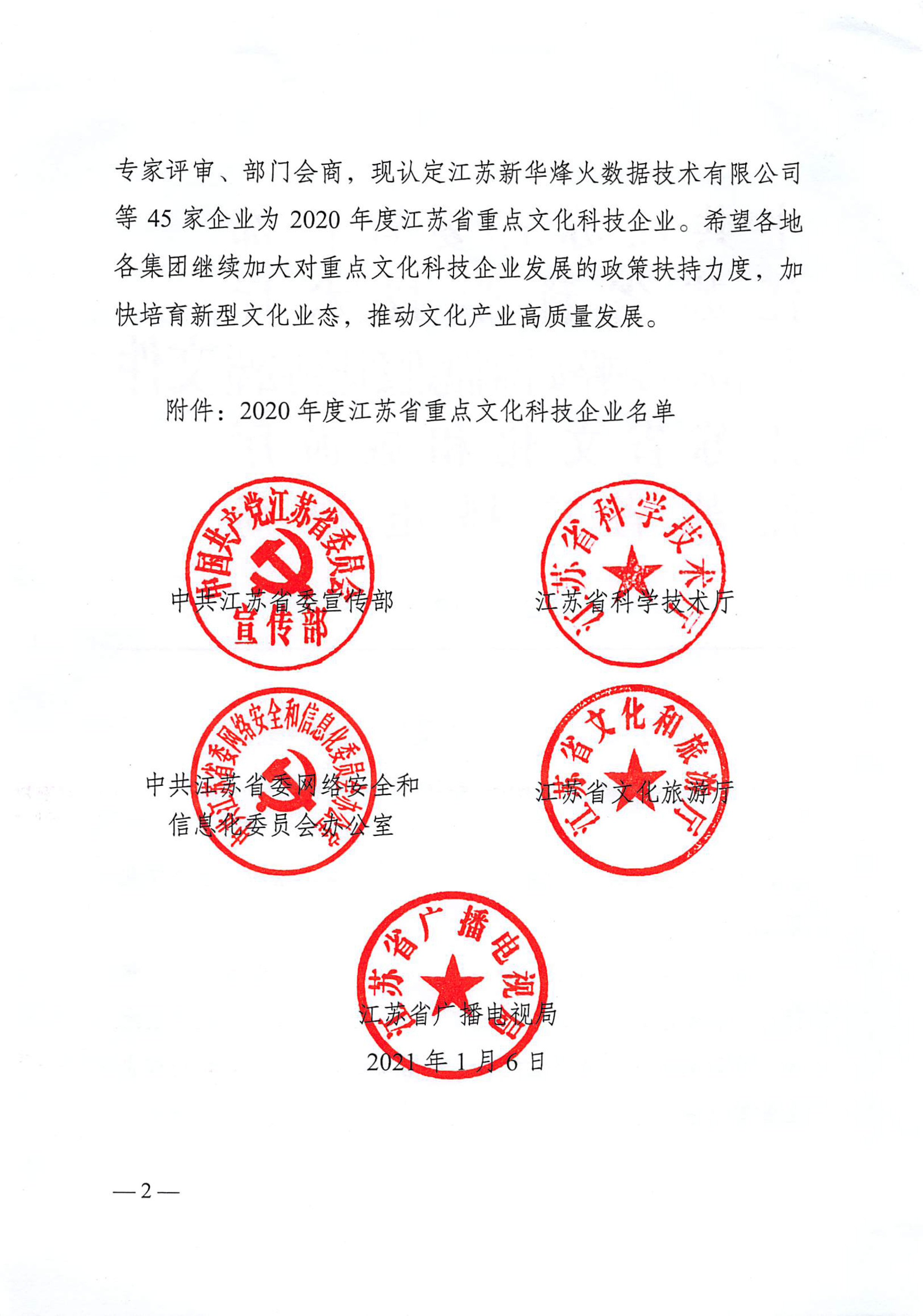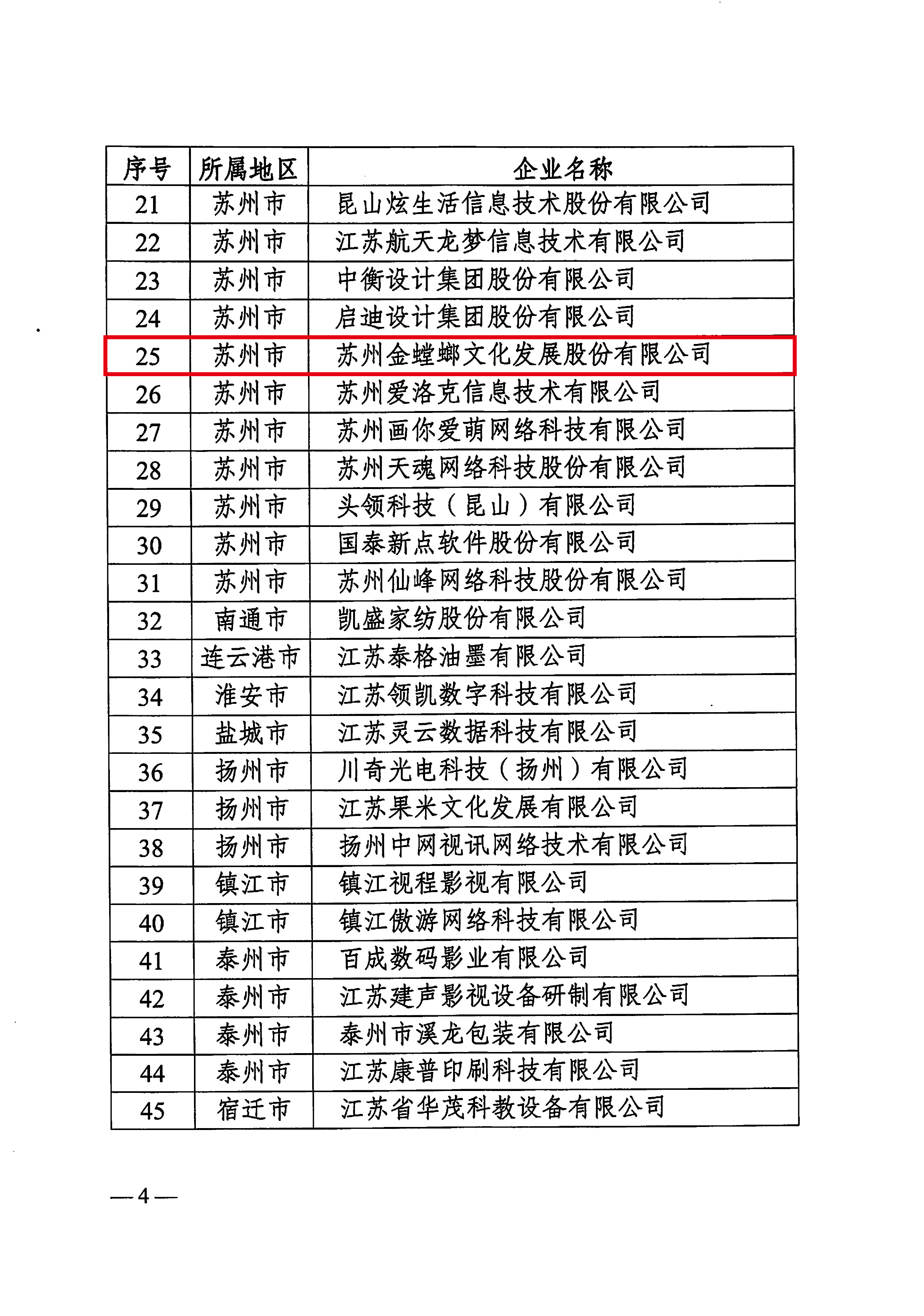 中共江蘇省委宣傳部、江蘇省科學技術廳、中共江蘇省委網絡安全和信息化委員會辦公室、江蘇省文化和旅游廳、江蘇省廣播電視局聯合發布了“關于認定2020年度江蘇省重點文化科技企業的通知”,金螳螂文化公司榜上有名 。