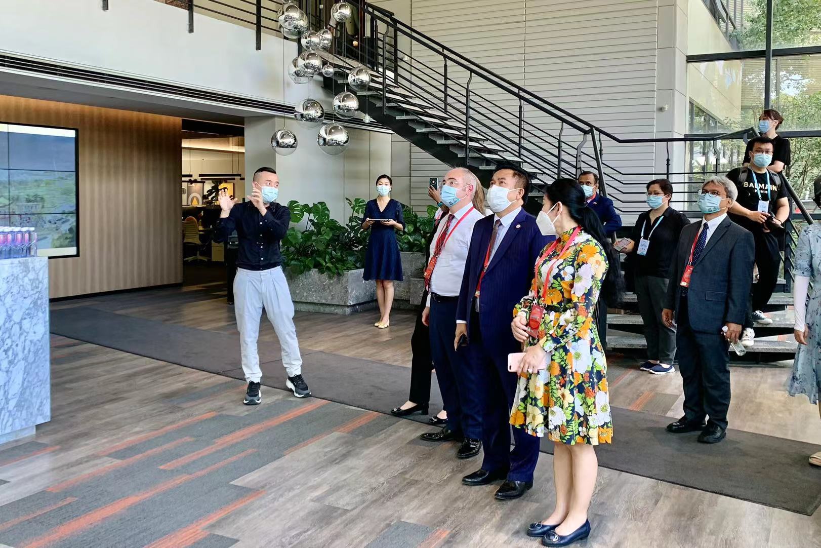 當天上午,來自哈薩克斯坦、吉爾吉斯斯坦、俄羅斯、塔吉克斯坦、烏茲別克斯坦、印度、伊朗,以及意大利、泰國、西班牙的駐華使節和代表參觀金浦九號文化產業園代表性入駐企業。