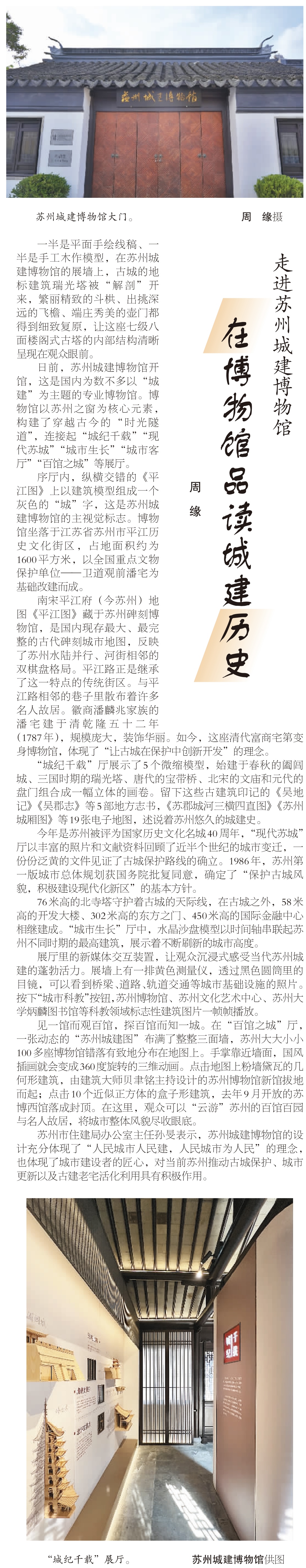 從小橋流水到繁華街市, 從亭臺樓閣到摩天大廈, 從限高24米的古城區(qū)出發(fā), 城市天際線不斷延伸, 蘇州城市發(fā)展的畫卷徐徐展開。 蘇州城建博物館邀您在平江古宅內(nèi), 縱覽姑蘇城市發(fā)展脈絡。 7月5日,《人民日報》(海外版)刊發(fā)文章《走進蘇州城建博物館——在博物館品讀城建歷史》,介紹蘇州城建博物館的立館初心、設計理念以及展陳內(nèi)容。 5月18日,蘇州城建博物館正式開館,這是國內(nèi)為數(shù)不多以“城建”為主題的專業(yè)博物館。 蘇州城建博物館坐落于江蘇省蘇州市平江歷史文化街區(qū),占地面積約為 1600 平方米,以全國重點文物保護單位——衛(wèi)道觀前潘宅為基礎改建而成。 南宋平江府 (今蘇州) 地圖 《平江圖》藏于蘇州碑刻博物館,是國內(nèi)現(xiàn)存最大、最完整的古代碑刻城市地圖,反映了蘇州水陸并行、河街相鄰的雙棋盤格局。 平江路正是繼承了這一特點的傳統(tǒng)街區(qū)。與平江路相鄰的巷子里散布著許多名人故居?;丈膛索胝准易宓呐苏ㄓ谇迩∥迨?1787年),規(guī)模龐大,裝飾華麗。如今,這座清代富商宅第變身博物館,體現(xiàn)了“讓古城在保護中創(chuàng)新開發(fā)”的理念。 以蘇州之窗為核心元素,蘇州城建博物館構(gòu)建了穿越古今的“時光隧道”,連接起“城紀千載”“現(xiàn)代蘇城”“ 城市生長”“城市客廳”“百館之城”等展廳。 步入序廳,墻壁上由平江圖縱橫阡陌的街巷格局衍化而來的城建博物館LOGO映入眼簾,以及極具意蘊的序言,營造出一種古色古香、厚重深廣的第一視覺印象。 一半是平面手繪線稿、一半是手工木作模型,城紀千載廳,古城的地標建筑瑞光塔被“解剖”開來,繁麗精致的斗栱、出挑深遠的飛檐、端莊秀美的壺門都得到細致復原,讓這座七級八面樓閣式古塔的內(nèi)部結(jié)構(gòu)清晰呈現(xiàn)在觀眾眼前。 源浚者流長,根深者葉茂。一個城市的歷史遺跡、文化古跡、人文底蘊,是城市生命的一部分。現(xiàn)代蘇城廳以文物陳列結(jié)合影像記錄的方式,講述蘇州近現(xiàn)代城建改造與保護的故事。呈現(xiàn)蘇州歷代城建人在老城區(qū)改造的同時,也在有意識、有目的的保護歷史遺跡、改善人居環(huán)境,延續(xù)城市文脈,使歷史故居和當代建筑相得益彰。 城市生長廳以影像采訪和榮譽陳列的形式,記載了為現(xiàn)代蘇城建設貢獻智慧與辛勞的勞模與集體。而地下管廊、建筑屋頂、抗風避震這樣的微創(chuàng)新技術縮模型則體現(xiàn)著蘇州城市建設中的當代智慧。 從1986年建成的開發(fā)大樓開始,一座座現(xiàn)代高樓拔地而起。城市生長廳正中以“城市生長”的互動展項串聯(lián)起蘇州不同時期的最高建筑,不斷升高的建筑天際線也象征了蘇州城市不斷發(fā)展的新高度。 城市會客廳整體保留了潘宅正廳——禮耕堂的建筑格局,抬頭可為清代四大書法家之一的梁同書所書的“禮耕堂”三字。 中堂設計以潘宅磚雕門頭為原型,借用唐代杜荀詩句鶴送人游吳,集字唐寅書法,采用漆畫工藝制作。整個大廳結(jié)構(gòu)規(guī)整,氣勢恢宏,為清乾隆時期具有代表性的建筑作品。一磚一瓦,一草一木,觸手可及三百年的滄桑變換。 一灣碧水護城安,兩岸美景入畫來。百館之城廳是一張可以通過觸摸交互觸發(fā)的手繪版“現(xiàn)代蘇州城建圖”,蘇州現(xiàn)存的103座博物館、169處市級控保建筑、65處各級文保單位,在這里,可以通過觸摸來感知深厚的蘇城的厚重歷史。 “城市”是一個大型的人類聚居地,是承載人類進步和發(fā)展的載體,是人類文明的鮮明標志,讓城市生活更美好,是城市建設、發(fā)展、治理的價值所在。 方寸之間,匯聚蘇州城建縮影?!叭嗣癯鞘腥嗣窠ǎ嗣癯鞘袨槿嗣瘛?,城建博物館是蘇州城建文化價值的縮影,承載著蘇州過去的厚重歷史,匯聚著對蘇州未來發(fā)展的美好愿景,將成為蘇州城建精神風貌的展示窗口與文化地標。